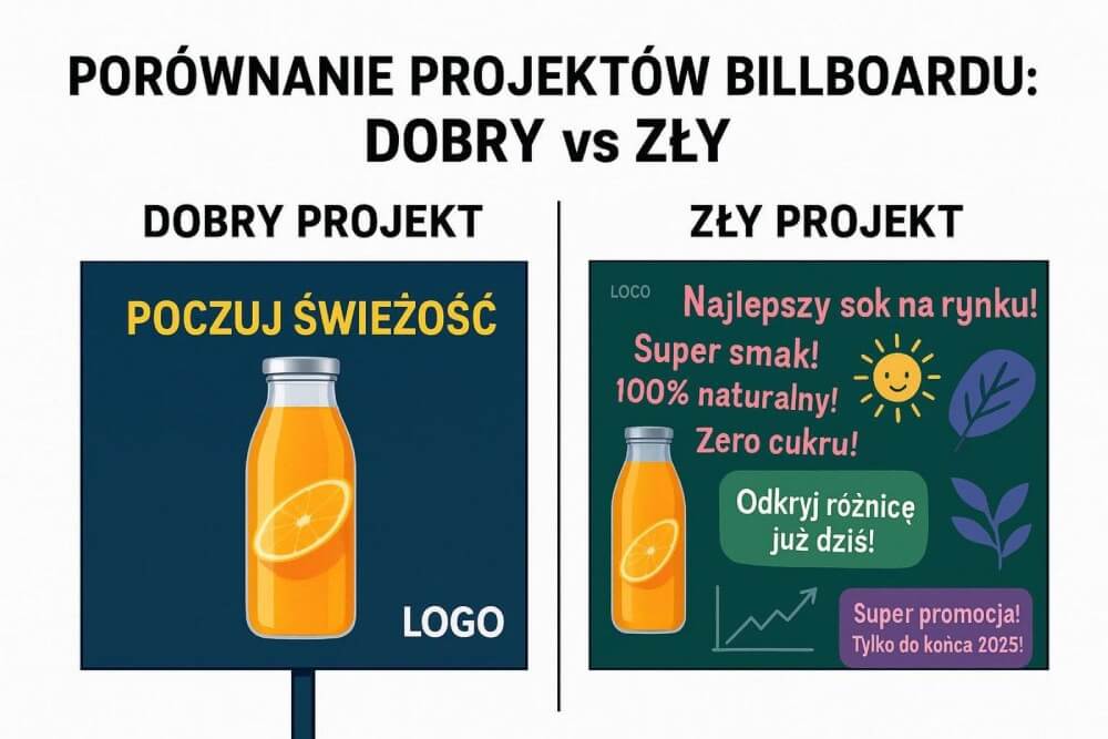 Najlepsze reklamy są krótkie i jasne. Przechodzień lub kierowca ma mało czasu, dlatego komunikat musi być zrozumiały od razu. Minimalistyczne projekty często wygrywają, jak w kampaniach z jednym zdjęciem produktu i krótkim hasłem.